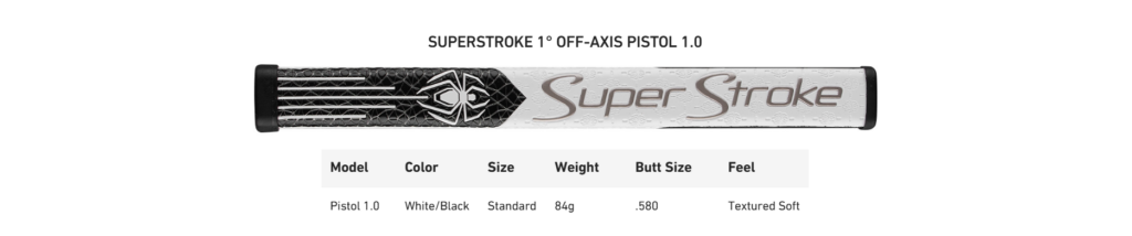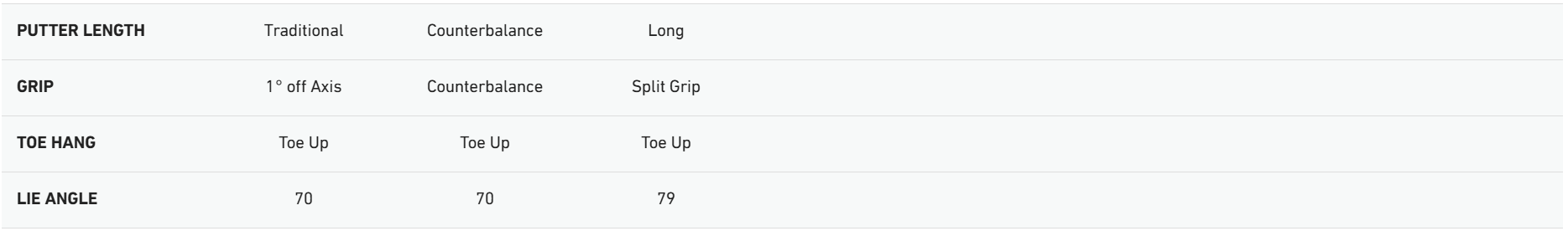 The KBS shaft is bored directly in line with the CG with slight forward shaft lean and 25mm onset behind the leading edge. This creates a toe-up orientation which enhances stability throughout the stroke. The SuperStroke 1.0 Pistol grip is also positioned in a manner that encourages forward shaft lean to minimize the addition of loft at impact.